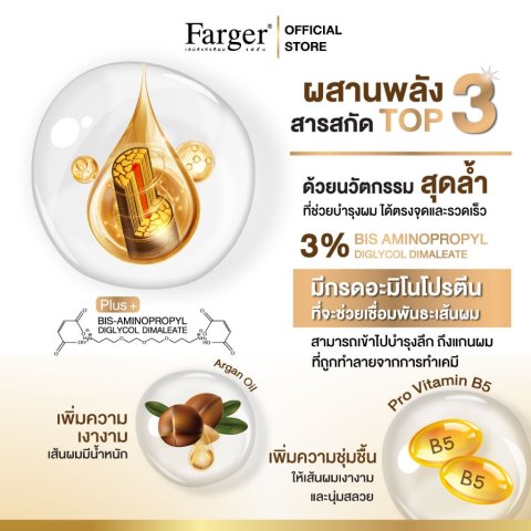 อุดมด้วยสารบำรุงระดับซาลอนอย่าง BIS-AMINOPROPYL DIGLYCOL DIMALEATE เข้มข้น 3% เสริมด้วย Pro Vitamin B5, Argan Oil และ Bis-Aminopropyl Dimethicone ที่ช่วยฟื้นบำรุงโครงสร้างเส้นผมจากภายใน เชื่อมซ่อมพันธะภายในเส้นผม (Disulfide Bond) ที่ถูกทำลายจากการทำสี ฟอก ดัด ยืด ให้ผมกลับมามีชีวิตชีวาอีกครั้ง