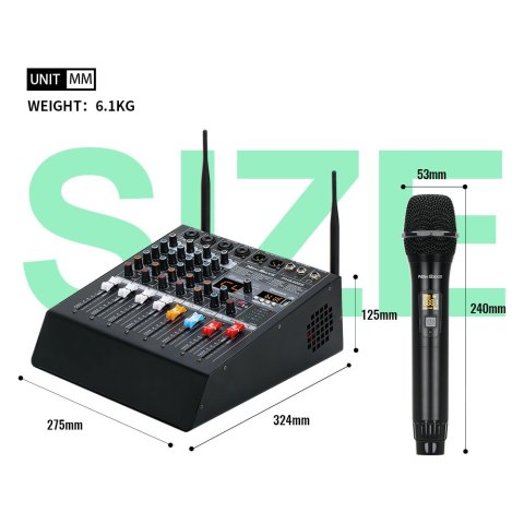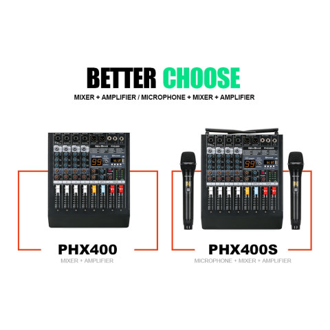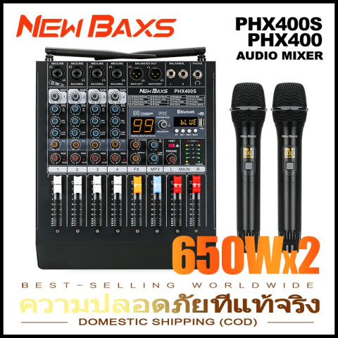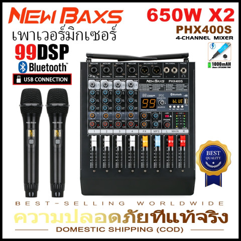 NEW BAXS PHX400S เครื่องผสมพลังงาน (Power Mixer) 4 ช่องทาง กำลังขับ 650W×2 มิกเซอร์ขยายเสียงระดับมืออาชีพแบบออลอินวัน มาพร้อมไมโครโฟนไร้สาย 2 ตัว ครอบคลุมระยะประมาณ 80 เมตร รองรับ USB/บลูทูธ และฟังก์ชันบันทึกเสียง พร้อมเอฟเฟกต์รีเวิร์บ DSP ช่วยให้เสียงร้องและดนตรีมีมิติ ใช้งานได้ครอบคลุมทั้งเวที คาราโอเกะ งานแต่ง งานประชุม และกิจกรรมกลางแจ้ง