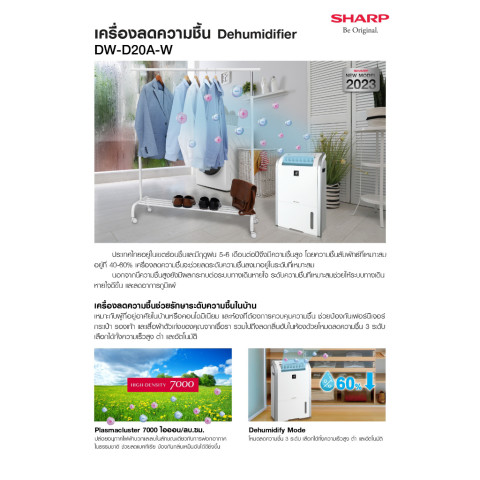 SHARP เครื่องลดความชื้น รุ่น DW-D20A-W (สีขาว) เครื่องลดความชื้นประสิทธิภาพสูง เหมาะสำหรับห้องขนาดไม่เกิน 50 ตร.ม. ช่วยปรับความชื้นให้อยู่ในระดับที่เหมาะสม ลดโอกาสเกิดเชื้อรา ลดกลิ่นอับ และช่วยให้หายใจโล่งขึ้น เหมาะมากทั้งบ้าน คอนโด ห้องนอน ห้องแต่งตัว หรือพื้นที่ที่มีความชื้นสะสม