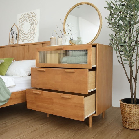 เพิ่มความเป็นระเบียบให้บ้านอย่างมีสไตล์ด้วยตู้ 3 ลิ้นชักรุ่นวาซาบิ ที่ผสานความทันสมัยเข้ากับเสน่ห์ลายไม้ธรรมชาติจาก ไม้ยางพาราแท้ ให้บรรยากาศอบอุ่น สะอาดตา และจัดเก็บของได้จุใจ พร้อมดีเทลหน้าบานกระจกลอนที่ช่วยเพิ่มมิติให้มุมห้องดูโดดเด่นยิ่งขึ้น