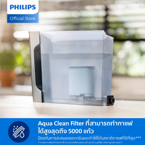 เครื่องยังมาพร้อมระบบ AquaClean สำหรับการกรองน้ำและช่วยลดคราบตะกรันในตัว ทำให้คุณไม่จำเป็นต้องขจัดคราบตะกรันแม้ใช้งานมากถึง 5,000 ถ้วย* เพียงแค่เปลี่ยนไส้กรอง AquaClean ตามรอบที่กำหนด ช่วยยืดอายุการใช้งานตัวเครื่องและรักษาคุณภาพรสชาติของกาแฟอย่างต่อเนื่อง