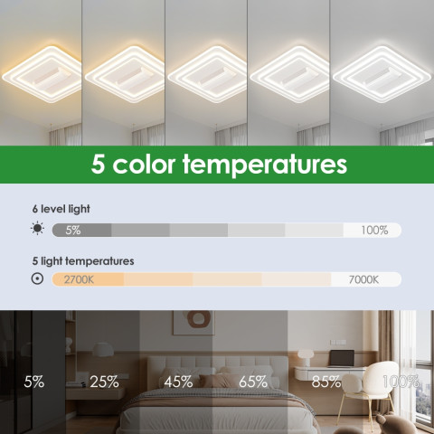 มาพร้อมพลังงานสูงถึง 60W ให้แสงสว่างทั่วถึงครอบคลุมพื้นที่ประมาณ 30㎡ พร้อมลูเมน 5400 LM สว่างชัดเต็มห้อง สามารถ ปรับสีไฟได้ 5 โทน ตามการใช้งาน เช่น แสงขาวสำหรับทำงาน แสงเหลืองนวลสำหรับพักผ่อน หรือโทนกลางสำหรับใช้งานทั่วไป ทั้งหมดควบคุมง่ายผ่านรีโมทคอนโทรล สะดวกสบายไม่ต้องลุกเปลี่ยนสวิตช์