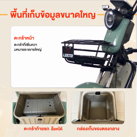 โครงสร้างตะกร้าหน้าและตะกร้าหลังผลิตจากเหล็กคาร์บอนสูง เสริมความหนาและขยายขนาดให้ใหญ่ขึ้น สามารถใส่ของได้จำนวนมาก ทั้งของใช้ในบ้าน สินค้าจับจ่าย หรือสัมภาระเพื่อการทำงาน ช่วยให้รถสามล้อไฟฟ้าคันนี้ตอบโจทย์ทั้งด้านการเดินทางและการใช้งานในชีวิตประจำวันได้ครบถ้วน