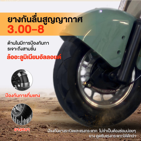 มาพร้อมไฟหน้า LED สว่างชัด ไฟเลี้ยว และไฟท้าย เพิ่มความปลอดภัยในตอนกลางคืนหรือพื้นที่แสงน้อย แผงหน้าปัด LCD แสดงสถานะต่าง ๆ ชัดเจน ทั้งความเร็วและระดับแบตเตอรี่ ยางสูญญากาศกันลื่นขนาด 3.00-8 เกาะถนนดี ลดโอกาสยางรั่วง่าย ล้ออลูมิเนียมแข็งแรงทนทาน น้ำหนักเบา ช่วยให้ควบคุมรถได้คล่องตัว