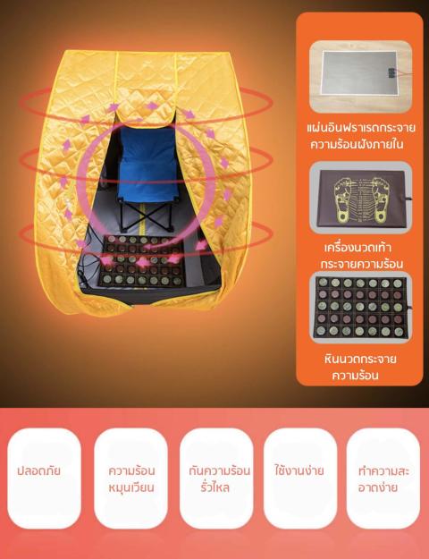 มีช่องเปิดสำหรับศีรษะและมือ ช่วยให้หายใจสะดวก ไม่อึดอัด สามารถเล่นโทรศัพท์ อ่านหนังสือ หรือดูทีวีระหว่างอบได้ พร้อมระบบตัดไฟอัตโนมัติเมื่อใช้งานครบเวลาหรืออุณหภูมิเกินกำหนด