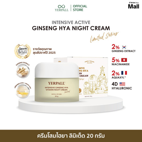 Limited Ginseng Hya ครีมโสมไฮยา วิตามิน ไนท์ ครีม 20g ไนท์ครีมบำรุงผิวเข้มข้นสำหรับการดูแลผิวตอนกลางคืน ช่วยเติมความชุ่มชื้นให้ผิวดูอิ่มฟู ลดความแห้งกร้าน พร้อมการบำรุงให้ผิวดูเรียบเนียน กระจ่างใสขึ้น เมื่อตื่นเช้ามาผิวดูสดใส สุขภาพดี เหมาะสำหรับคนที่ต้องการฟื้นบำรุงผิวให้ดูดีขึ้นแบบเร่งด่วนในทุกคืน