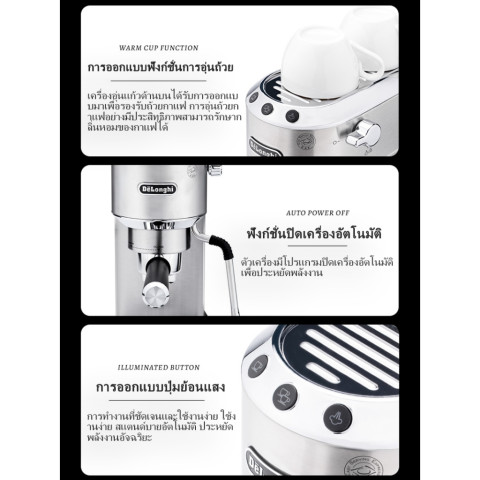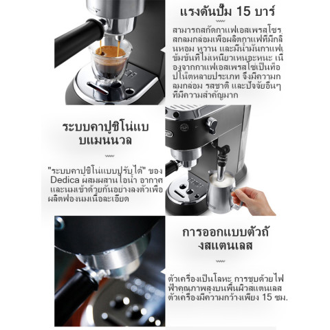 Delonghi EC885 DEDICA ARTE เครื่องชงเอสเปรสโซกึ่งอัตโนมัติ ดีไซน์สเตนเลสสุดพรีเมียม หน้ากว้างเพียง 15 ซม. เหมาะกับทุกเคาน์เตอร์ครัว ให้คุณทำเอสเปรสโซหอมเข้ม ครีม่าหนานุ่ม และเมนูนมอย่างคาปูชิโน่/ลาเต้ได้เหมือนคาเฟ่ในบ้าน ในราคา 9,199.60 บาท