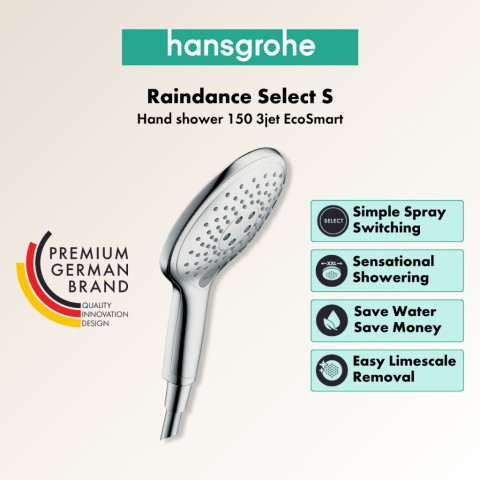 Hansgrohe Raindance Select S ฝักบัวมือขนาด 150 มม. ดีไซน์พรีเมียมจากเยอรมนี มอบประสบการณ์อาบน้ำที่นุ่มสบาย ปรับได้ถึง 3 โหมดน้ำ พร้อมฟังก์ชันประหยัดน้ำ EcoSmart ช่วยลดการใช้น้ำโดยไม่ลดทอนความสบาย เหมาะทั้งการติดตั้งใหม่และเปลี่ยนเฉพาะหัวฝักบัวด้วยเกลียวมาตรฐาน ใช้งานง่ายในทุกวัน