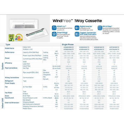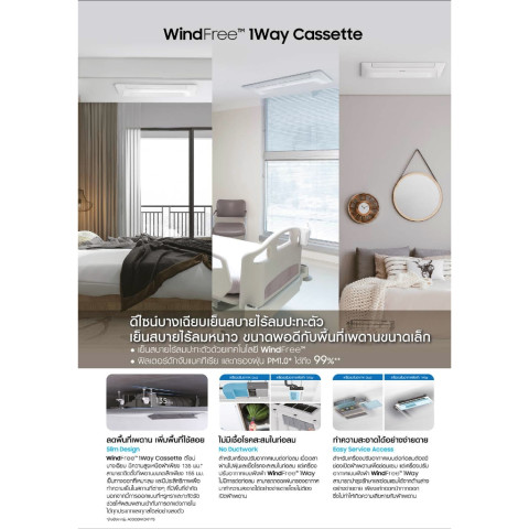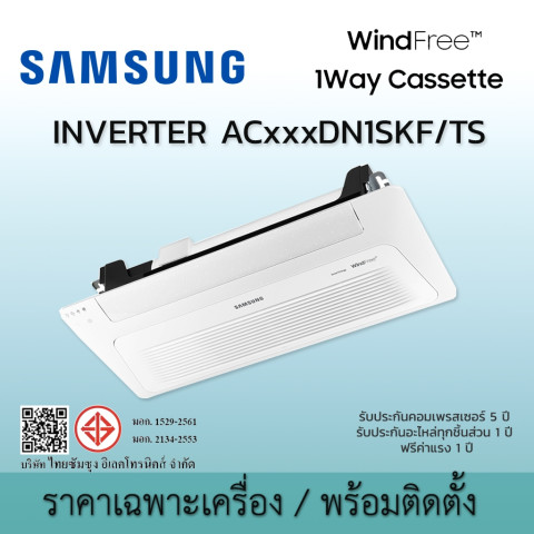 แอร์ 1 ทิศทาง เครื่อง/พร้อมติดตั้ง SAMSUNG WindFree 1 Way Cassette รุ่น AC-DN1SKF/TS (R-32 Inverter) ทางเลือกสำหรับบ้านและออฟฟิศที่ต้องการความเย็นสบาย “แบบไม่ปะทะตัว” ด้วยเทคโนโลยี WindFree™ กระจายลมผ่านรูขนาดเล็กกว่า 10,000 รู ช่วยให้ห้องเย็นนุ่มนวล ลดความอึดอัดจากลมแรง พร้อมชุดติดตั้งมาตรฐานและบริการติดตั้งตามพื้นที่ที่เลือก