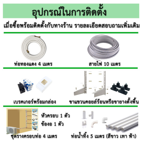 งานติดตั้ง ไม่รวมการเดินเมนไฟ (ต้องมีไฟมารอที่คอยล์ร้อน หากให้ทางร้านเดินเมนไฟมีค่าใช้จ่ายเพิ่ม)