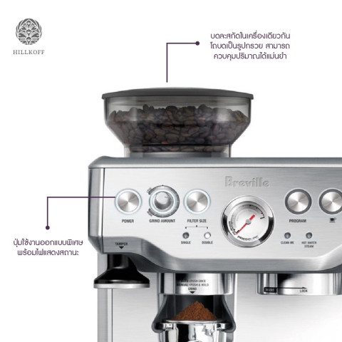 ยกระดับประสบการณ์การดื่มกาแฟที่บ้านให้ใกล้เคียงคาเฟ่มืออาชีพด้วย Hillkoff : เครื่องชงกาแฟ Breville BES870 Barista Express สี Silver เครื่องชงเอสเปรสโซ่สุดฮิตที่รวมฟังก์ชันบดและชงไว้ในเครื่องเดียว ใช้งานง่าย ดีไซน์หรู แข็งแรงทนทาน เหมาะทั้งสำหรับบาริสต้ามืออาชีพและผู้รักกาแฟที่ต้องการคุณภาพระดับคาเฟ่ในทุกเช้า