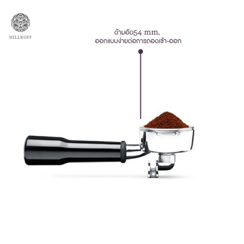 แทมเปอร์หัวสแตนเลส ขนาด 54 มม. ให้แรงกดสม่ำเสมอ ช่วยให้การสกัดเสถียร และสามารถจัดเก็บเข้าตัวเครื่องได้อย่างเรียบร้อย