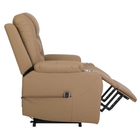 วัสดุหุ้มเป็นหนัง Premium สีนน้ำตาลให้ลุคหรูหรา ดูแลรักษาง่าย ทนต่อการขีดข่วน เพียงใช้ผ้าชุบน้ำหมาดเช็ดก็สะอาดเหมือนใหม่ ที่วางแขนดีไซน์กว้างสบาย พร้อมที่วางแก้วทั้งสองข้าง (ขนาดเส้นผ่านศูนย์กลางประมาณ 9 ซม. ลึก 5.5 ซม.) ให้คุณจิบเครื่องดื่มโปรดไปพร้อมกับการพักผ่อน และยังมีกระเป๋าด้านข้างกว้างถึง 46 ซม. สำหรับเก็บรีโมท นิตยสาร หรืออุปกรณ์จำเป็นต่างๆ ให้หยิบใช้ได้สะดวก