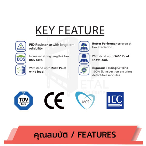 ประกันวัสดุ 12 ปี (ครอบคลุมเฉพาะความผิดปกติจากตัวเซลล์/แผงด้านใน ตรวจประเมินโดยบริษัทผู้เกี่ยวข้อง)