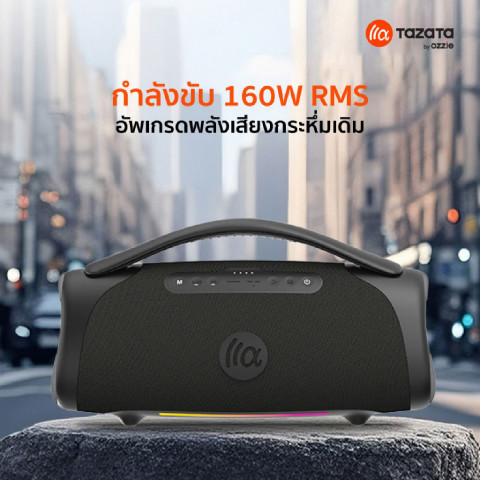 Tazata Boomblast Max Bluetooth Speaker (Black) ลำโพงปาร์ตี้พกพาพลังเสียงระดับจัดเต็ม 160W RMS (สูงสุด 180W Peak) ให้รายละเอียดเสียงคมชัด เสียงกลางแน่น และเบสทรงพลัง กระหึ่มเต็มพื้นที่ทั้งในบ้านและกลางแจ้ง พร้อม ไฟ RGB เต้นตามจังหวะ เลือกได้ถึง 5 โหมด (หรือปิดไฟได้ตามต้องการ) เพิ่มบรรยากาศให้ทุกงานสนุกยิ่งขึ้น