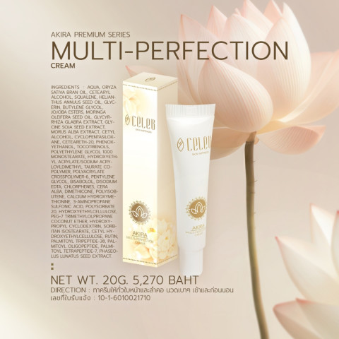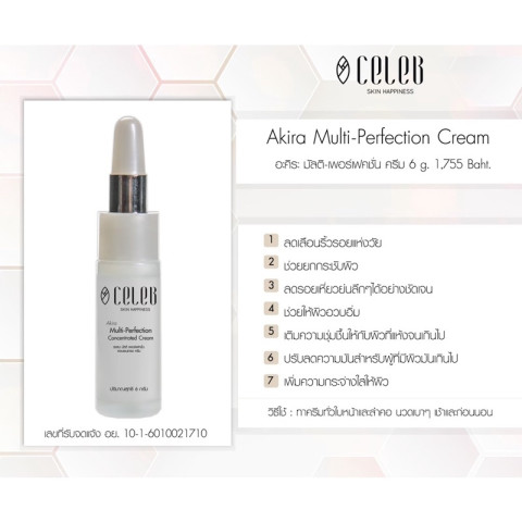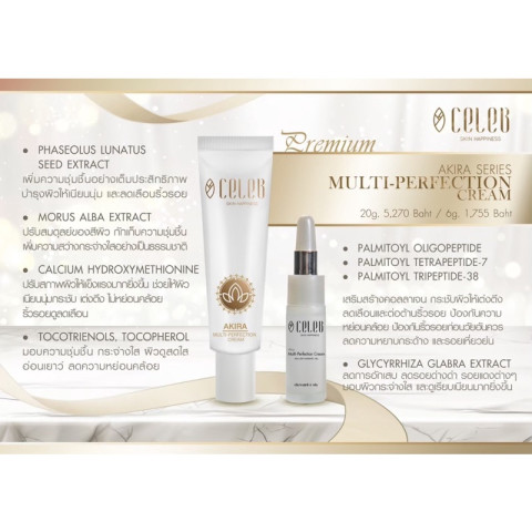 CelebSkin Akira Multi-Perfection Cream ครีมบำรุงผิวระดับพรีเมียมจาก Celeb Skin Happiness ที่ออกแบบมาเพื่อดูแลผิวอย่างรอบด้าน ทั้งลดเลือนริ้วรอยลึก เพิ่มความชุ่มชื้น และช่วยให้ผิวแลดูอวบอิ่มกระชับขึ้น เหมาะสำหรับผู้ที่ต้องการครีมกระปุกเดียวจบเพื่อผิวดูเรียบเนียน กระจ่างใส และสุขภาพดีในทุกวัน