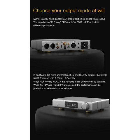 เลือกได้ทั้ง XLR เท่านั้น / RCA เท่านั้น / RCA+XLR และยังมีตัวเลือกแรงดันเอาต์พุตเพื่อความเข้ากันได้กับอุปกรณ์หลากหลาย (เช่น XLR 4V/5V และ RCA 2V/2.5V)โหมดปรีแอมป์ในตัว ต่อเข้าลำโพงแอคทีฟ/เพาเวอร์แอมป์ได้