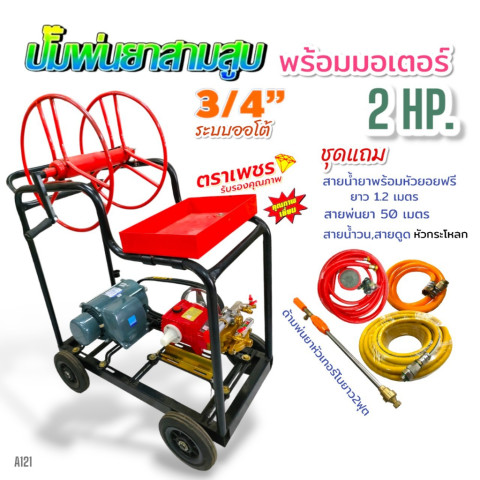 เครื่องพ่นยา 3 สูบ พร้อมมอเตอร์ไพโอเนีย 2 HP ตราเพชร รุ่น TS-25E (A121) แท่น 4 ล้อ ราคา 14,535.00 บาท