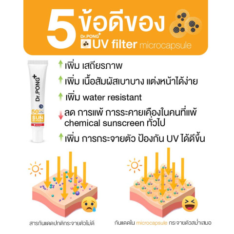 Dr.PONG Hyaluronic Ultra Light Sunscreen with Aquatide SPF50 PA+++ ครีมกันแดดหน้าสูตรอ่อนโยน กันแดดเนื้อน้ำสัมผัสบางเบา สบายผิว ไม่เหนอะหนะ เหมาะกับทุกวันและสามารถทาทับระหว่างวันได้ ช่วยปกป้องผิวจากรังสี UVA/UVB ด้วยค่า SPF50 PA+++ พร้อมเทคโนโลยี Microcapsule ที่ช่วยเพิ่มความเสถียรของกันแดดแม้ผ่านไปประมาณ 6 ชั่วโมงหลังทา ให้ผิวดูนุ่ม ชุ่มชื้น ไม่แห้งกร้านหลังออกแดด