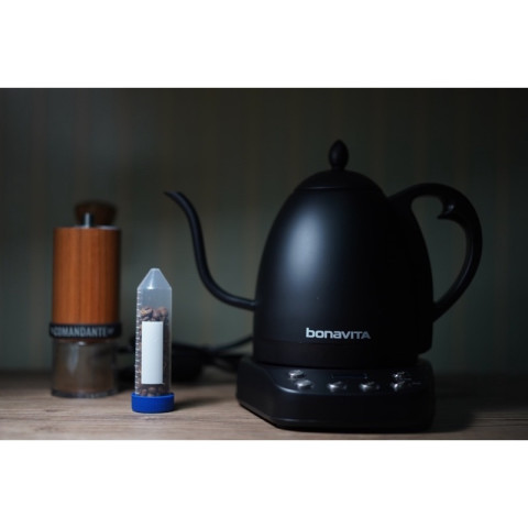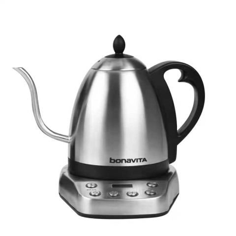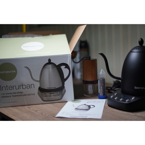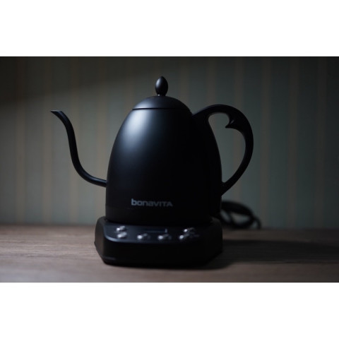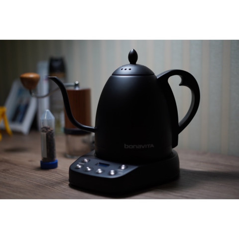 กาต้มน้ำไฟฟ้า Bonavita รุ่น Variable Temp Gooseneck ผลิตจากสแตนเลสผิว Brushed และพลาสติกปลอดสาร BPA ความจุ 1.0 ลิตร ปรับอุณหภูมิได้ละเอียดระดับ 1°C ตั้งแต่ 60–98°C (เลือกแสดงผลได้ทั้ง °C/°F) มาพร้อมกำลังไฟ 1000W ต้มน้ำไว และมีโหมด Hold Temp ช่วยรักษาอุณหภูมิได้นานถึง 1 ชั่วโมง ให้คุณตั้งค่าน้ำร้อนล่วงหน้าแล้วเริ่มดริปได้ทันทีเมื่อพร้อม