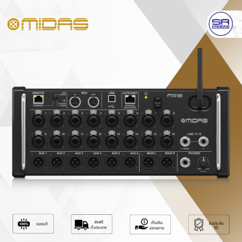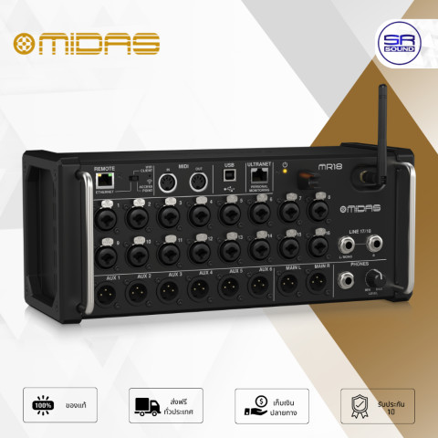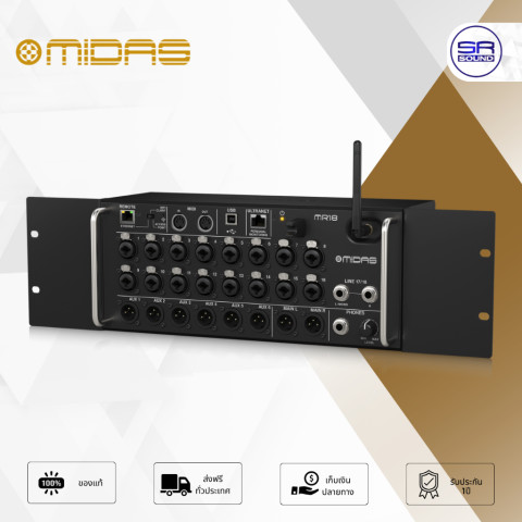 MIDAS MR18 Digital Mixer ดิจิตอลมิกเซอร์แบบแร็ค 18 แชนแนล ที่ให้คาแรกเตอร์เสียงสไตล์ MIDAS กลางหนา นวล และหนักแน่น ใกล้เคียงตระกูล M32 เหมาะทั้งงานไลฟ์ งานสตูดิโอ และงานเคลื่อนที่ที่ต้องการความคล่องตัวสูง ควบคุมผ่าน iPad/Android และคอมพิวเตอร์ได้อย่างอิสระ พร้อม WiFi ในตัว และทำงานเป็น 18×18 USB Audio Interface สำหรับอัด Multitrack ได้ทันที