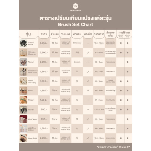 SUPERMOM l Sandalwood series set ชุดแปรงแต่งหน้าระดับไฮเอนด์ที่รวมทุกการใช้งานไว้ในเซตเดียว 15 ด้าม โดดเด่นด้วยขนแปรงสังเคราะห์เกรดพรีเมี่ยมจากนวัตกรรมล่าสุด ให้สัมผัส นิ่มละมุน แต่ยังคงความ สปริงตัวดี เกลี่ยเนียน คุมทิศทางง่าย เหมาะทั้งมืออาชีพและสายสะสมที่ต้องการงานคุณภาพแบบ “มีแล้วจบ”