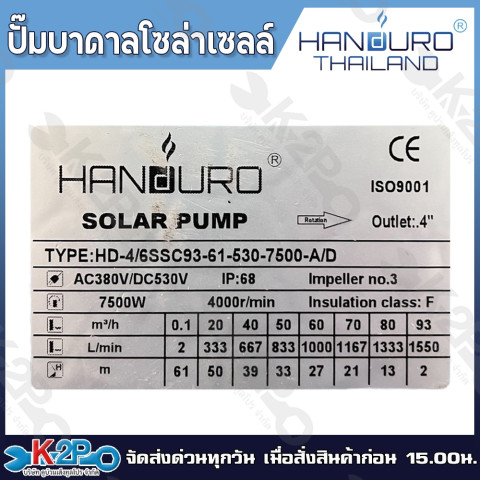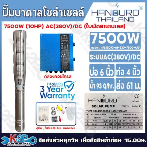 HANDURO ปั๊มบาดาล โซล่าเซลล์ AC/DC 7500W ทางเลือกทรงพลังสำหรับงานสูบน้ำบาดาลที่ต้องการความคุ้มค่าและความยืดหยุ่น ใช้งานได้ทั้ง ไฟบ้าน (AC) และ ไฟโซล่าเซลล์ (DC) เหมาะสำหรับเกษตรกรรม ระบบน้ำในไร่/สวน ฟาร์ม หรือพื้นที่ที่ไฟฟ้าเข้าไม่เสถียร ให้ปริมาณน้ำสูงและส่งน้ำได้ไกล ช่วยให้งานรดน้ำและสูบน้ำต่อเนื่องได้มั่นใจ พร้อม รับประกันศูนย์ 3 ปีเต็ม