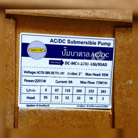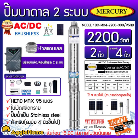 MERCURY ปั๊มบาดาล AC/DC 2ระบบ รุ่น DC-MC4-2200-300/95A ตัวช่วยสูบน้ำบาดาลประสิทธิภาพสูง สำหรับงานเกษตร รดน้ำสวน เติมแท็งก์ หรือใช้งานในพื้นที่ห่างไกล จุดเด่นคือรองรับการทำงาน 2 ระบบ ใช้ได้ทั้ง ไฟบ้าน (AC) และ โซลาร์เซลล์ (DC) มาพร้อม กล่องคอนโทรล ติดตั้งและควบคุมการทำงานได้สะดวก โครงสร้างและหัวปั๊มสแตนเลส ช่วยเพิ่มความทนทานต่อการใช้งานต่อเนื่องในบ่อ