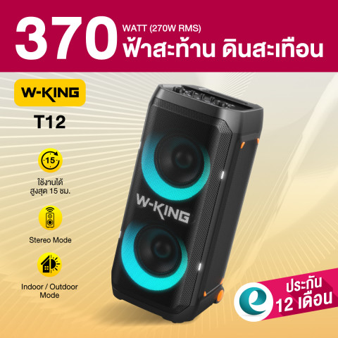 [ประกันศูนย์ไทย 1 ปี] W-King T12 270W RMS ลำโพงบลูทูธตั้งพื้น/ลำโพงปาร์ตี้พลังเสียงจัดเต็ม ดีไซน์แกร่ง พร้อมไฟเอฟเฟกต์กระพริบตามจังหวะเพลง เหมาะทั้งงานสังสรรค์ในบ้านและเอาท์ดอร์ ให้เบสแน่น รายละเอียดเสียงครบ และสนุกได้ยาว ๆ ด้วยแบตอึดสูงสุด 15 ชั่วโมง (ที่ความดังประมาณ 50%) พร้อมมาตรฐานกันน้ำ IPX7 ใช้งานได้มั่นใจมากขึ้นในทุกสภาพแวดล้อม