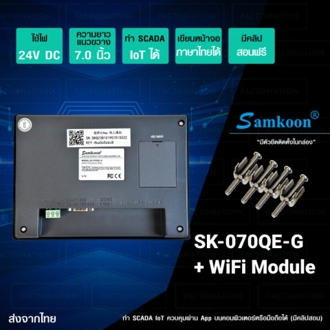 SAMKOON หน้าจอทัชสกรีน HMI Touchscreen 7.0" รุ่น SK-070QE-G + WiFi Module คือจอ HMI สำหรับงานอุตสาหกรรมที่ออกแบบมาเพื่อการควบคุมและแสดงผลเครื่องจักรอย่างมืออาชีพ มาพร้อมความละเอียดสูง 1024×600 ความสว่าง 450 cd/m² สีสันคมชัด 16.77 ล้านสี และรองรับการเชื่อมต่อผ่าน WiFi เพื่อการใช้งานด้าน SCADA/IoT ได้สะดวก เหมาะสำหรับตู้คอนโทรล โรงงาน ระบบอัตโนมัติ และงานโปรเจกต์ที่ต้องการจอคุณภาพในงบคุ้มค่า