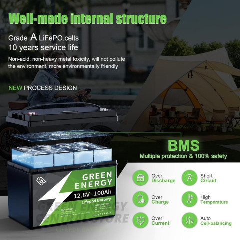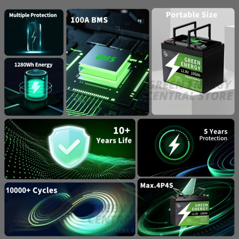 แบตลิเธียม LiFePO4 GREEN ENERGY 12.8V 100Ah แบตเตอรี่พลังงานแสงอาทิตย์ น้ำหนักเบา อายุการใช้งานยาวนาน พร้อมระบบป้องกัน BMS ในตัว เหมาะสำหรับงานเก็บพลังงานทั้งโซลาร์ รถบ้าน เรือ และการใช้งานกลางแจ้งต่างๆ ในราคาสุดคุ้ม 6,360.48 บาท