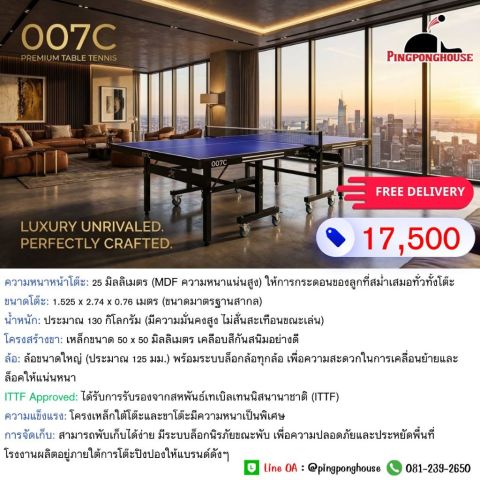 ราคา 18,900.00 บาท (เฉพาะ กทม. และปริมณฑลส่งฟรี) พร้อมใช้งาน “พร้อมตีเลย” เหมาะทั้งซ้อมจริงจังและใช้งานระดับแข่งขัน ด้วยผิวโต๊ะ MDF หนา 25 มม. ให้การกระดอนนิ่ง สม่ำเสมอ ใกล้เคียงสนามมาตรฐาน