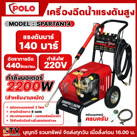 POLO เครื่องอัดฉีดแรงดันสูง รุ่น SPARTAN14 เครื่องฉีดน้ำแรงดันสูงสำหรับงานหนัก ช่วยขจัดคราบฝังแน่นได้อย่างรวดเร็ว เหมาะทั้งงานล้างรถ ล้างพื้น ล้างกำแพง ล้างอุปกรณ์ เครื่องมือ หรือทำความสะอาดทั่วไป ให้พลังแรงดันสม่ำเสมอ ใช้งานกับไฟบ้าน 220V พร้อมสายอัดฉีดยาว 8 เมตร เพิ่มความคล่องตัวในการทำงาน
