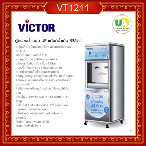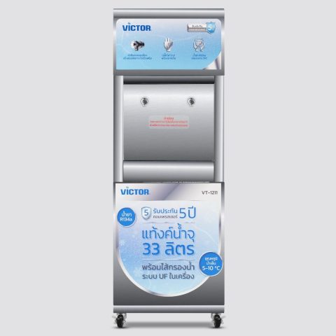 VICTOR ตู้กดน้ำ ระบบ UF 2 ก๊อก รุ่น VT1211 ตู้กดน้ำเย็นพร้อมเครื่องกรองน้ำในตัว ดีไซน์สแตนเลสแท้ แข็งแรง ทนทาน เหมาะสำหรับบ้าน สำนักงาน โรงเรียน หรือพื้นที่ที่ต้องการน้ำดื่มสะอาดพร้อมใช้งานตลอดวัน ด้วยแท้งค์น้ำเย็นขนาดใหญ่ 33 ลิตร ให้บริการได้ต่อเนื่อง และให้น้ำเย็นอุณหภูมิประมาณ 5-10°C สดชื่นทันใจทุกแก้ว ในราคา 22,990.00 บาท