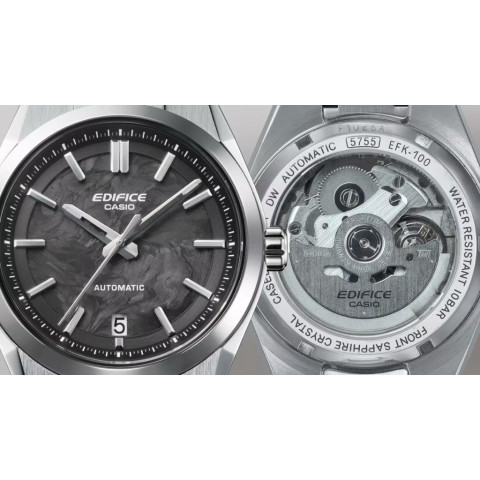 CASIO EDIFICE AUTOMATIC EFK-100CD Series (EFK-100CD-1A/7A/2A/3A และ EFK-100XPB-1A) นาฬิกาออโตเมติกระดับพรีเมียมที่ผสานแรงบันดาลใจจากโลกมอเตอร์สปอร์ตเข้ากับวัสดุไฮเอนด์อย่าง Forged Carbon บนหน้าปัด ถ่ายทอดอารมณ์ความเร้าใจราวรถสปอร์ตที่พุ่งสู่สมรรถนะขั้นสูง ดีไซน์คลาสสิกแบบ 3 เข็ม อ่านเวลาได้ชัดเจน พร้อมความหรูคมเข้มตามสไตล์ EDIFICE เหมาะทั้งใส่ทำงานและลุคสปอร์ตสุดเนี้ยบ