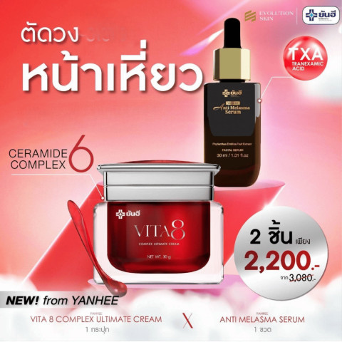 YANHEE VITA8 COMPLEX ULTIMATE CREAM [เมลาสม่า 2 +ไวต้าเอจ 2] ครีมบำรุงผิวหน้าสูตรพรีเมียมจากทีมวิจัยโรงพยาบาลยันฮี ที่ออกแบบมาเพื่อดูแลผิวคนไทยโดยเฉพาะ ช่วยให้ผิวดูอ่อนเยาว์ขึ้น ลดเลือนริ้วรอย ความหย่อนคล้อย และจุดด่างดำ พร้อมฟื้นบำรุงเกราะป้องกันผิวให้แข็งแรง เนื้อครีมซึมไว เกลี่ยง่าย ไม่เหนอะหนะ ใช้ได้ทุกสภาพผิว โดยเฉพาะช่วงวัย 40+ ที่ต้องการการบำรุงล้ำลึกเป็นพิเศษ