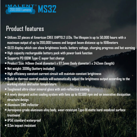 IMALENT MS32 ไฟฉายสว่างที่สุด 200,000 ลูเมน ไฟฉายระดับโปรที่ให้แสงสว่าง “สุดขีด” สำหรับงานกลางแจ้งและภารกิจจริงจัง ส่องได้ไกลสูงสุด 1,618 เมตร ให้ประสิทธิภาพเทียบเท่าไฟรถยนต์มากกว่า 100 ดวง มาพร้อมจอ Smart OLED แสดงสถานะสำคัญครบ ใช้งานง่ายด้วยสวิตช์คู่ และยังทำหน้าที่เป็น Power Bank ได้ เหมาะทั้งนักผจญภัยและมืออาชีพด้านค้นหา-กู้ภัย