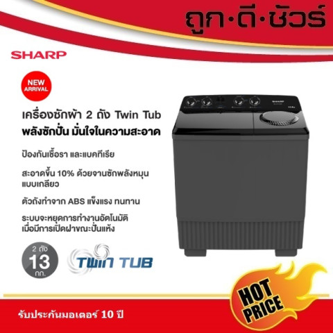 SHARP เครื่องซักผ้า 2 ถัง รุ่น ES-TW130BK (ถังซัก 13 kg / ถังปั่น 7.5 kg) ราคา 5,033.00 บาท ตัวช่วยซักผ้าคู่บ้านที่ให้ทั้งความจุใหญ่และความสะดวกในการใช้งาน เหมาะสำหรับครอบครัวที่มีผ้าปริมาณมาก ต้องการซักสะอาดทั่วถึง พร้อมดูแลเรื่องกลิ่นอับและความปลอดภัยขณะปั่นแห้ง