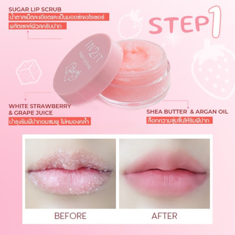 เผยริมฝีปากเนียนนุ่ม อมชมพู ดูอิ่มฟูด้วย IN2IT SUGAR LIP SCRUB - SLS01 สครับปากหวาน ลิปสครับจากน้ำตาลเม็ดเล็กละเอียด ที่ช่วยผลัดเซลล์ผิวที่ตายแล้วออกอย่างอ่อนโยน เผยริมฝีปากนุ่มเรียบลื่น แต่งหน้าติดง่าย และช่วยลดปัญหาริมฝีปากแห้งลอกเป็นขุยได้อย่างเห็นผล
