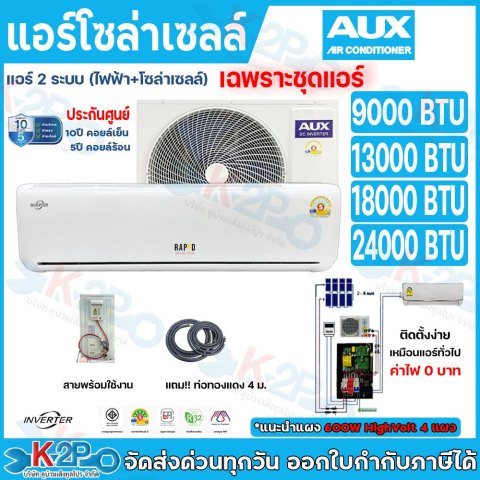 ชื่อสินค้า: AUX แอร์โซล่าเซลล์ 2 ระบบ HYBRID (โซล่าเซลล์ + ไฟบ้าน) สลับอัตโนมัติ