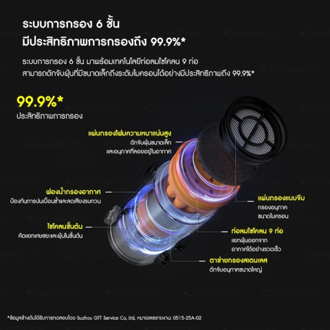 เทคโนโลยีไซโคลน 9 ท่อช่วยแยกฝุ่นและสิ่งสกปรกออกจากอากาศอย่างมีประสิทธิภาพ ลดการอุดตัน รักษาแรงดูดให้คงที่ พร้อมระบบกรองหลายชั้น ช่วยดักจับฝุ่นละเอียดได้ดี ทำให้ลมที่ออกมาสะอาดมากขึ้น เหมาะสำหรับบ้านที่มีเด็กหรือผู้แพ้ง่ายดูดและถูในครั้งเดียว ประหยัดเวลา