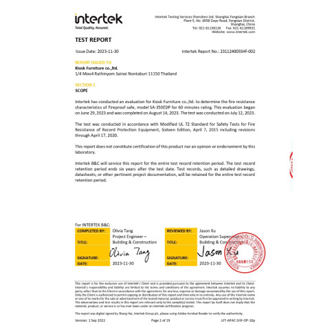 ตัวตู้ผลิตจากเหล็กคุณภาพสูง โครงสร้างแข็งแรง สามารถป้องกันไฟได้ยาวนานถึง 1 ชั่วโมง ผ่านการทดสอบและได้รับการรับรองมาตรฐานการกันไฟ ETL certified fireproof test ด้วยมาตรฐาน UL72 จากสถาบัน Intertek ระดับโลก มั่นใจได้ว่าทรัพย์สินภายในจะได้รับการปกป้องอย่างดีในกรณีเกิดเหตุฉุกเฉิน