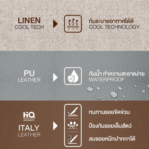 หนังเทียมคุณภาพสูง สัมผัสนุ่มคล้ายหนังแท้ กันน้ำ เช็ดทำความสะอาดง่าย พิมพ์ลายหนังสวยงาม ดูหรูหรา ดูแลรักษาง่าย เหมาะสำหรับบ้านที่มีเด็กเล็กหรือสัตว์เลี้ยง