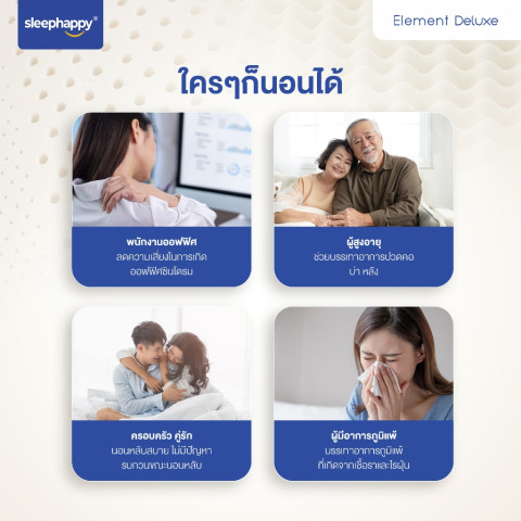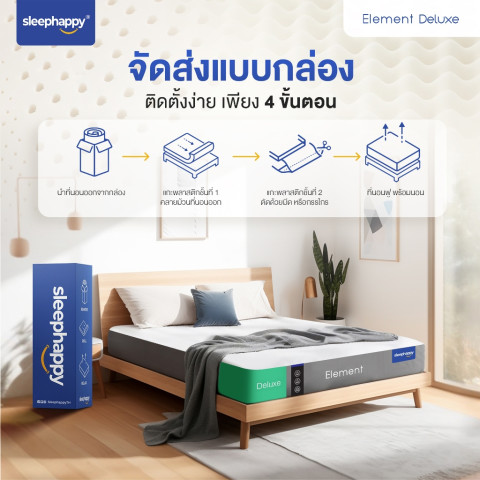 SleepHappy Element Deluxe คือทางเลือกที่ลงตัวสำหรับผู้ที่มองหาที่นอนยางพาราแท้เพื่อสุขภาพ นอนสบาย รองรับสรีระดี ใช้งานได้ยาวนาน คุ้มค่าทั้งราคาและคุณภาพ เหมาะทั้งสำหรับห้องนอนหลัก คอนโด หรือเป็นของขวัญให้คนที่คุณรัก