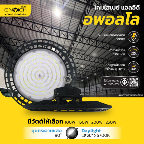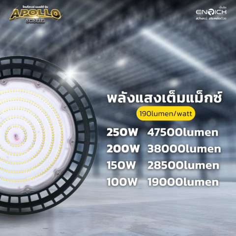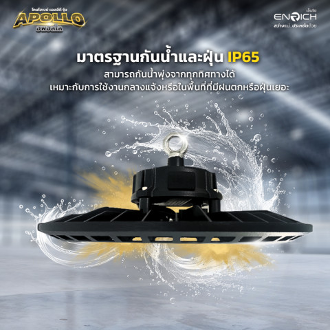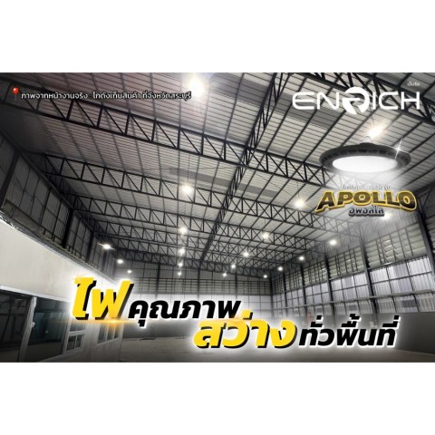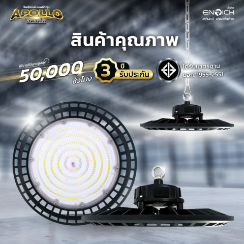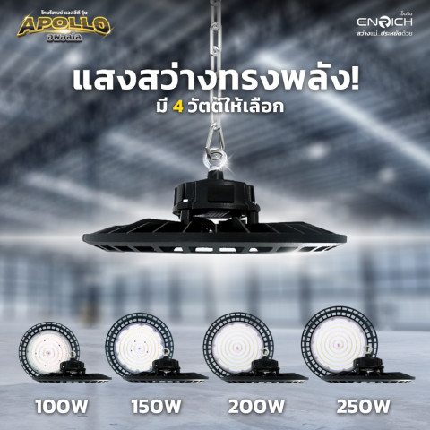 โคมไฮเบย์ ENRICH LED High Bay รุ่น APOLLO คือคำตอบสำหรับผู้ที่ต้องการแสงสว่างทรงพลัง ประหยัดไฟ ทนทาน ได้มาตรฐาน เหมาะอย่างยิ่งสำหรับปรับปรุงระบบแสงสว่างในโรงงานหรือโกดังให้สว่างขึ้น คุ้มค่ามากขึ้น และดูแลรักษาน้อยลงในระยะยาว