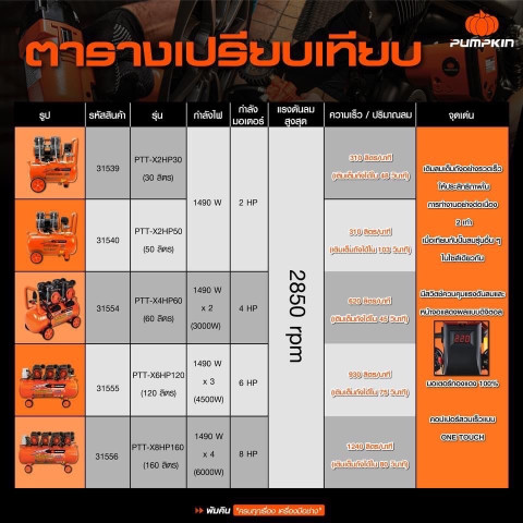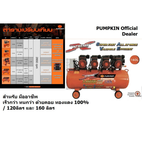 ปั๊มลม Highspeed ปั๊มเร็ว 2850 รอบ แบบ Oil Free จาก PUMPKIN EXTREME Series (ของแท้) ตัวเลือกถัง 120 ลิตร และ 160 ลิตร ออกแบบมาเพื่อให้งานลมของคุณ “ทันใจ” ด้วยอัตราการผลิตลมสูง เติมลมไว ใช้งานต่อเนื่องได้ลื่นไหล เหมาะทั้งงานช่าง งานซ่อมบำรุง งานพ่นสี/เป่าทำความสะอาด และงานลมทั่วไปที่ต้องการความคล่องตัวและแรงลมสม่ำเสมอ