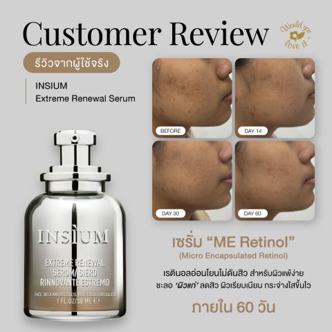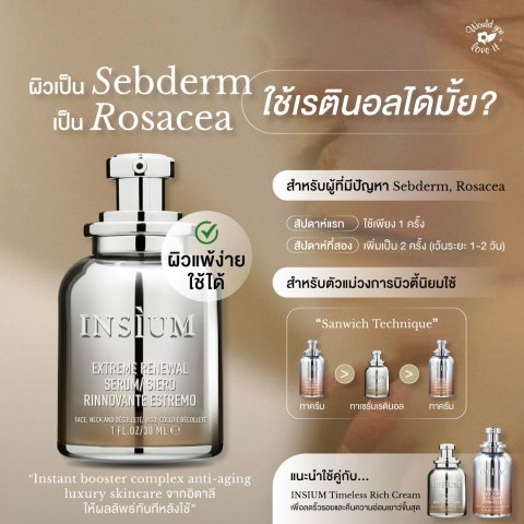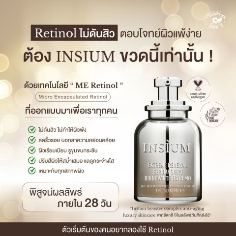 INSIUM (อินซิอุม) EXTREME RENEWAL SERUM เซรั่มเรตินอลบำรุงผิวหน้า ขนาด 30 ml สูตรเข้มข้นเพื่อการฟื้นบำรุงผิวอย่างล้ำลึก ช่วยลดเลือนริ้วรอยให้ผิวดูเรียบเนียน กระชับ และเปล่งประกายสุขภาพดี พร้อมแนวคิดการดูแลผิวแบบอ่อนโยนที่หลายคนมองหาในกลุ่มเรตินอล ด้วยการออกแบบสูตรให้ใช้ได้ต่อเนื่องและสบายผิว โดยเน้นผลลัพธ์เรื่องความเรียบเนียนและริ้วรอยเป็นหลัก