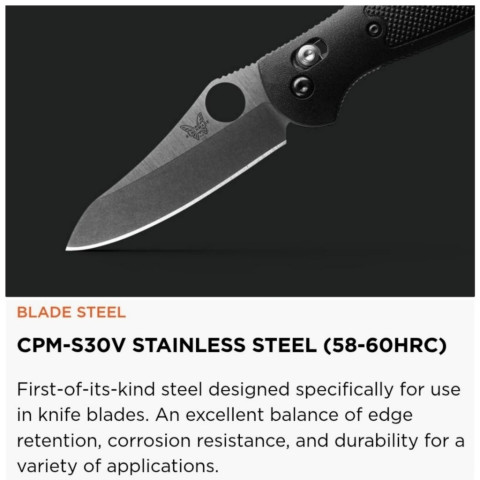 เหล็กใบมีด CPM-S30V (Premium Stainless Steel): เหล็กยอดนิยมในกลุ่มมีดคุณภาพสูง ทนการสึกหรอ รักษาคมได้ดีเยี่ยม และมีความต้านทานสนิมสูง เหมาะมากสำหรับงานใช้งานจริงเป็นประจำ