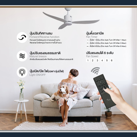 ควบคุมการทำงานได้สะดวกสบายด้วย รีโมทคอนโทรล เพียงอันเดียว เลือกเปิด–ปิด ปรับระดับความแรงลม และเปลี่ยนโทนแสงได้อย่างง่ายดาย ไม่ต้องเดินไปกดสวิตช์ให้ยุ่งยาก เหมาะกับการใช้งานในชีวิตประจำวันของทุกคนในบ้าน