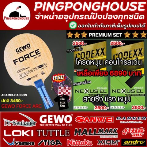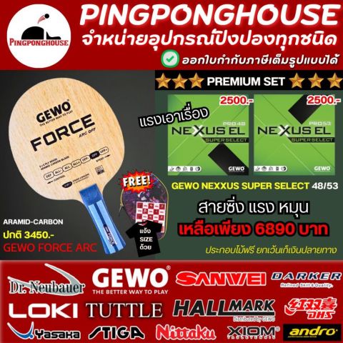 (Premium Set) GEWO Force Arc เซ็ตไม้ปิงปองสายบุกระดับพรีเมียม พร้อมยางปิงปองตระกูล GEWO Super Select ให้เลือก 2 ชุด ตามสไตล์การเล่น ตอบโจทย์ทั้งสาย “เร็ว-แรงแบบยุโรป” และสาย “หมุนจัด หน้ายางจิกสไตล์จีน” ในชุดเดียว จัดเต็มพร้อมของแถมคุ้มๆ ในราคา 6,980.00 บาท